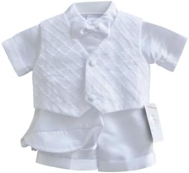 **Description:** A classic boy baptism outfit consisting of a white short-sleeve shirt with buttons on the back, a patterned vest, a tie, and a white hat. The short has an adjustable elastic waist for comfort.